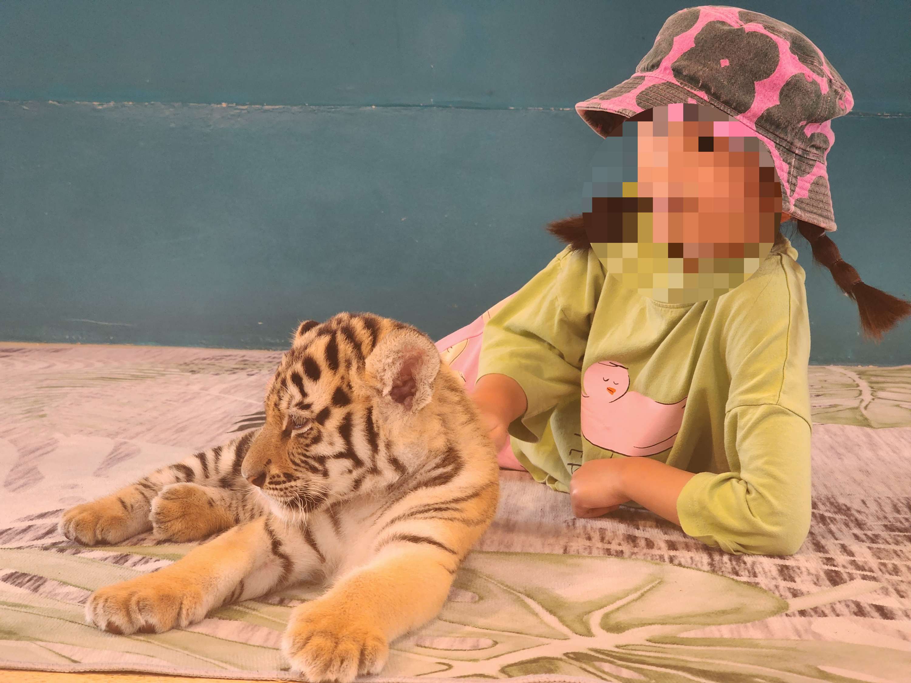 저희의 경우는, 와이프는 이 공간 밖에 있고 저와 아이만 들어갔습니다. 당연히 저희 아이는 완전히 좋아했습니다. 신기해했죠! 동물원에서 봤던 그 무시무시한 호랑이를 만져볼 수 있는 기회이니, 뭐라고 뭐라고 계속 말하면서 20여 분 동안 즐겁게 시간을 보냈습니다. 사진도 많이 찍고, 영상도 찍고 말이죠!