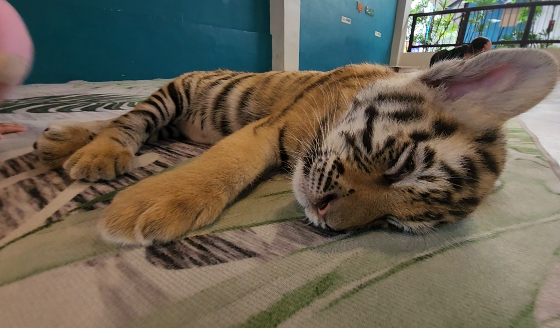 아.. 그런데 말입니다. 저는 성인이고 당연히 성인의 눈으로 볼 수밖에 없으니, 첫인상은 매우 별로였습니다. 이게 물론 저의 추측일 수 있습니다. 추측이겠거니 하면서 혹시 이 포스팅을 읽는 분들은 그걸 감안해서 읽어주시면 좋겠습니다. 간혹 후기를 보니, 호랑이들이 자고 있어서 아쉬웠다는 글을 중간중간 봤는데, 더운 나라라서 그런가 보다 했었거든요. 그런데, 교감을 하는 극소수의 호랑이 말고는 전부 다 자고 있었습니다. 사실 자고 있다기보다는 강제로 재워지고 있는 것처럼 느껴졌습니다. 그게 아니라면 어떻게 그렇게 많은 호랑이들이 다 자고 있을까?... 사진을 찍고 싶지도 않게 좁은 공간에 한 마리씩 넣어져서 자고 있는 모습만 보다 왔습니다.