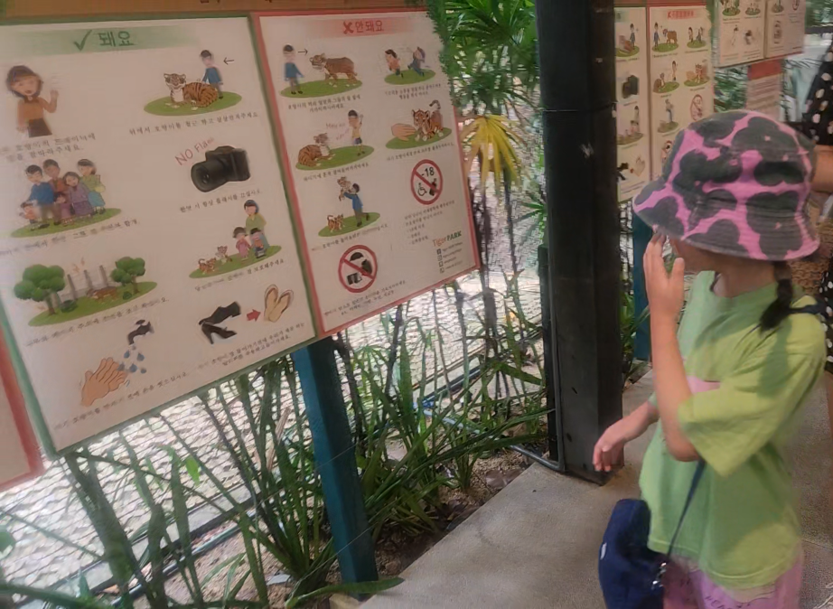 저희가 아이와 함께 경험했던 "뉴 본 타이거"를 만났습니다. 이런 구조인데, 위에서 말씀드렸듯이, 저 사이로 충분히 사진을 직접 찍으실 수 있습니다. 진짜 개인적으로는, 전문사진사가 찍어준 사진이 막 그렇게 판타스틱하지는 않습니다. 당시에는 태어난 지 두 다된 호랑이 라고 하셨습니다. 오른인 저도 엄청 신기했습니다.