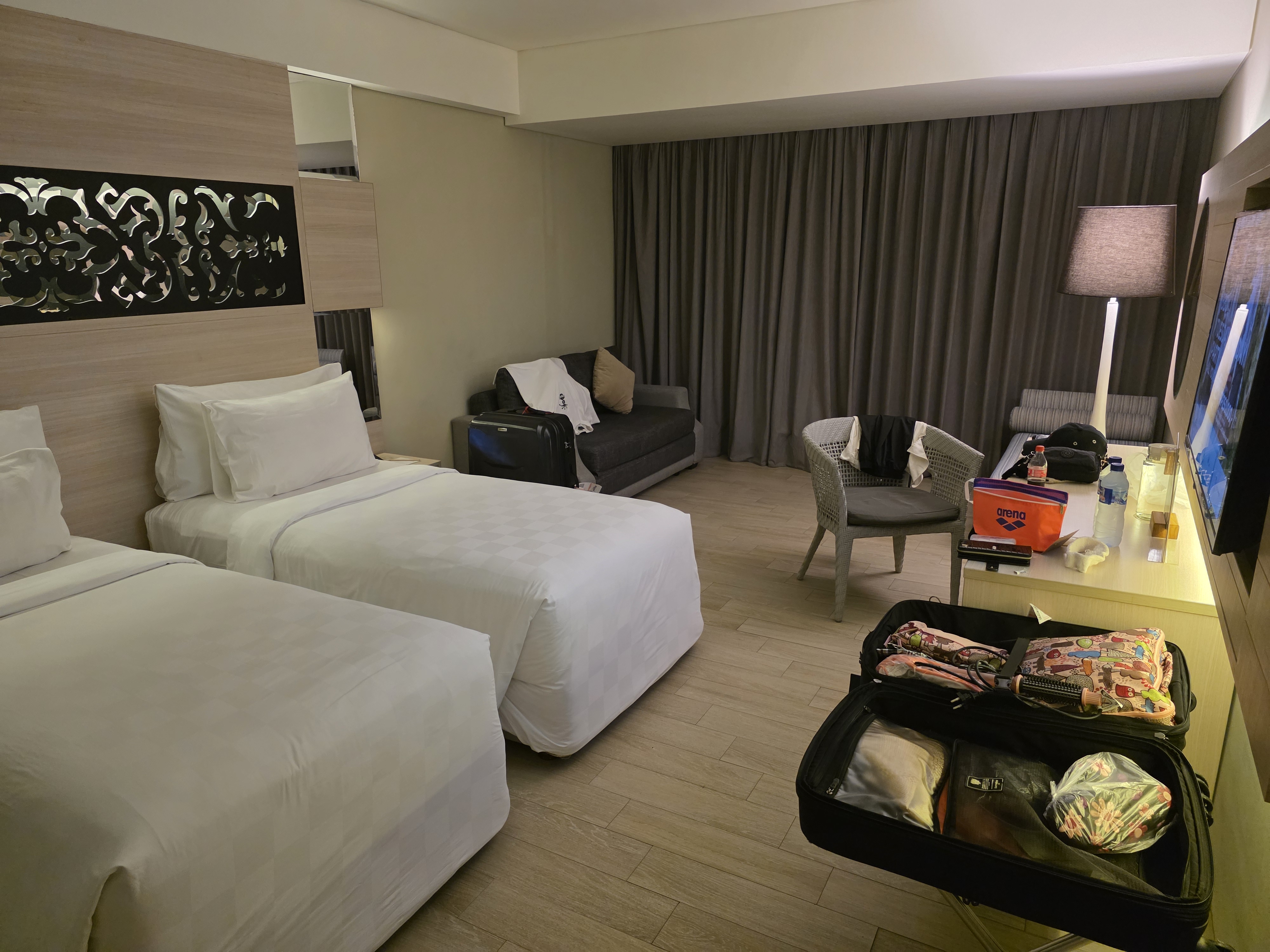 제가 예약할때만 해도 이 호텔 이름이 스위스 벨 호텔 투반이었는데, 도착당일 기준(2025.08.15) 이미 호텔이름이 아나테라 리조트로 바뀐 후였습니다. Anathera Resort Kuta는 웅우라이 발리 공항과 15분 정도 거리에 있습니다. 사실 원래는 힐튼 가든인 발리 웅우라이 에어포트 호텔로 예약을 할까 했었는데, 은근 구글 리뷰가 좋지 않아서 아나테라 리조트로 마음을 바꿔먹고 예약을 했습니다. 저는 총 세 개의 객실을 예약했는데요, 7명이 함께한 대가족 발리여행이었기 때문에, 두 개의 객실은 풀뷰 더블룸으로 했고, 하나는 트리플베드룸으로 예약을 했습니다.